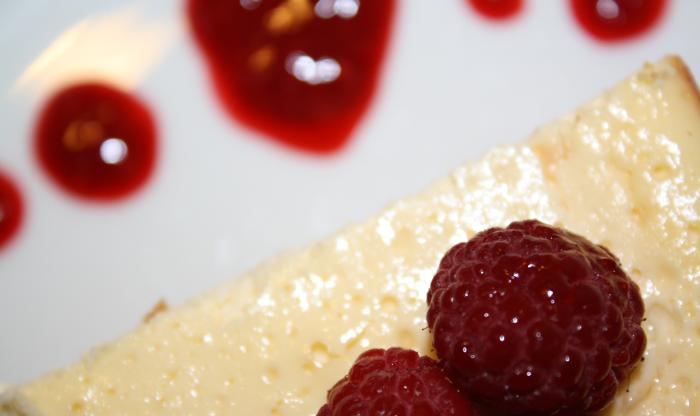 Ein gekühltes Stückchen Cheesecake mit heißen Himbeeren – einfach himmlisch!