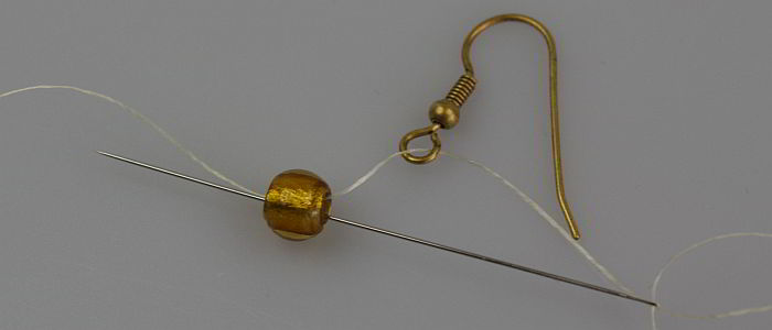 - Schneiden Sie mindestens 60 cm Fädelgarn ab und ziehen Sie ein Ende auf die Perlennadel. Fädeln Sie dann die Öse des Ohrhakens sowie eine 6mm-Perle auf das Garn. Die Nadel muss auf der Seite des Ohrhakens eingefädelt sein.