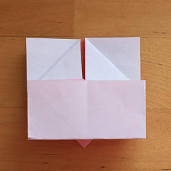 5. Vor Ihnen liegt nun eine Bastelarbeit in Form eines Rechtecks. Klappen Sie den unteren Teil nach oben. Drunter liegt die Spitze des Papierherzes verborgen.