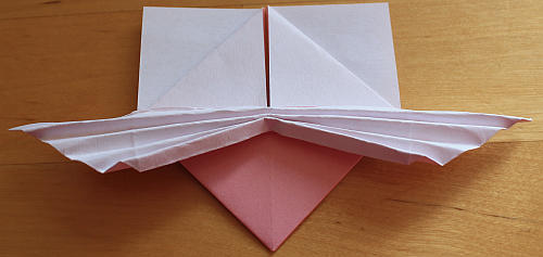 Ziehen Sie dann bei der eben gemachten Faltung rechts und links die Ecken raus, so dass seitlich zwei Spitzen abstehen.